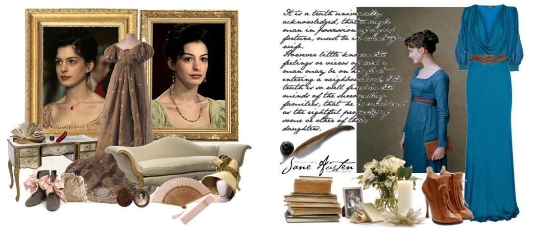 A segunda dica é que no site da Polyvore (onde podemos criar nossos próprios estilos com roupas, sapatos e acessórios de marca), Natallie encontrou algumas montagens sobre Austen e os filmes baseados em seus livros. Nesse site, as pessoas fazem montagens de fotos de celebridades, personagens para combinar com as roupas. Natallie está cadastrada no site e acabou adicionando todas as coleções que encontrou sobre Austen e seus personagens. O link para perfil de Natallie é esse aqui. Abaixo, algumas imagens criadas por fãs do mundo inteiro: