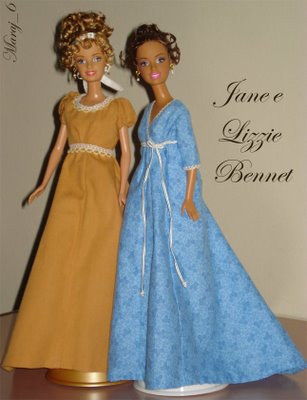 A primeira é sobre um blog de bonecas Barbie. A Natallie encontrou um blog só de coleções da Barbie, inclusive algumas roupinhas são feitas pela própria dona do blog. O que chamou a atenção foi que ela tem duas Barbies: Jane e Elizabeth Bennet. Veja abaixo as mocinhas:
