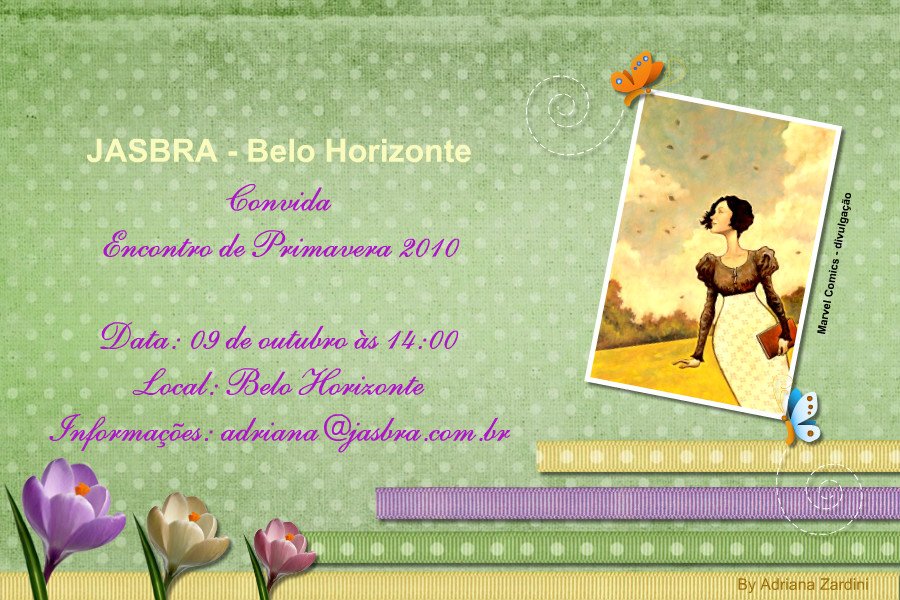 a JASBRA fará um Encontro de Primavera em Belo Horizonte, e eu gostaria de convidar todos que desejarem participar. Obviamente não se trata de um encontro nacional, mas será uma boa oportunidade para colocarmos o papo em dia e conhecermos novas (os) Janeites/Austenites!