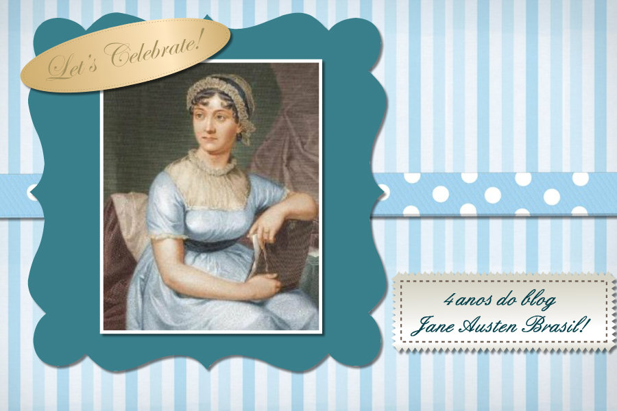 Neste final de semana o blog Jane Austen Brasil comemorou 4 anos de existência! É com muito prazer e satisfação com comemoro esta datas com vocês, queridos leitores e amigos! Comecei a postar algumas coisinhas simples em fevereiro de 2008. Ontem, realizamos aqui em Belo Horizonte um singelo encontro em homenagem ao aniversário e só posso dizer que é cada vez mais prazeroso falar sobre Jane Austen! Entramos para o nosso 5o ano de funcionamento e espero que muitos outros virão! Viva Austen! Afinal, ela é a única razão para este blog existir!
