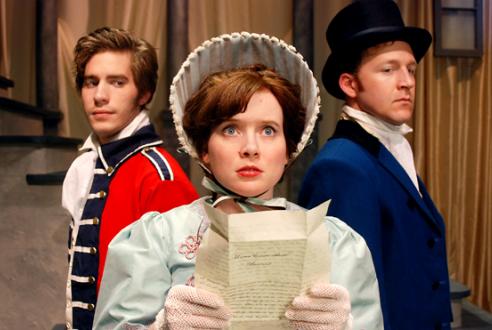 James Gasber, Laura McClain e Dennis Grimes em Orgulho e Preconceito no Teatro Lifeline