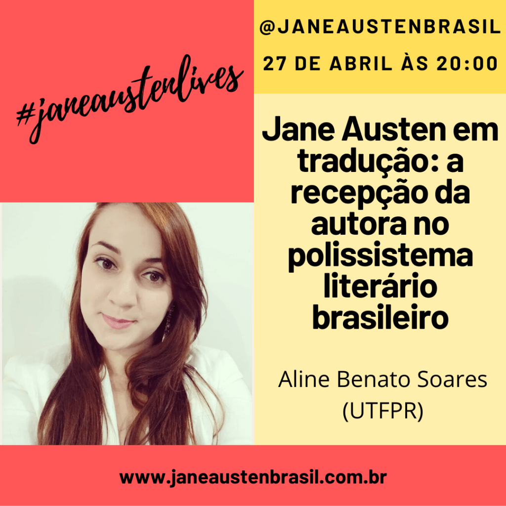 Nossa convidada para a próxima #janeaustenlives (27 de abril às 20:00 – horário de Brasília) é a Aline Benato Soares. Nossa conversa vai girar em torno da pesquisa que ela fez a respeito da recepção das obras de Jane Austen no mercado brasileiro.