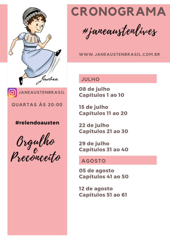 Dando continuidade ao projeto #relendoausten vamos realizar a leitura dos clássicos de Jane Austen no formato digital, por meio de #janeaustenlives no nosso perfil @janeaustenbrasil no Instagram. O segundo livro que vamos ler/reler é #orgulhoepreconceito – veja a programação de leituras na imagem acima. Essa é uma parceira com o ig @liliabooks – Está aberto a todos que desejarem participar. Junte-se a nós! #janeaustenbrasil #janeaustensociedadedobrasil #janeaustensocietyofbrasil #jasbra