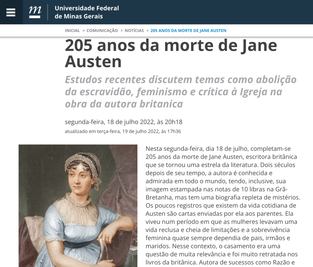 Neste aniversário de morte de Jane Austen, o programa Universo Literário conversou sobre essas novas visões da obra da autora com a professora Adriana Salles, doutora em Estudos Linguísticos pela UFMG, tradutora, especialista em Jane Austen e presidente da Jane Austen Sociedade do Brasil.