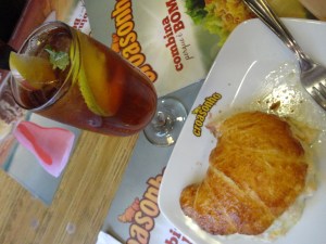 Para começar preciso dizer do delicioso chá gelado! Chá do pomar com limão siciliano e rodelas de maçã e laranja! Uma delícia! O croassaint é recheado com peito de peru e requeijão!