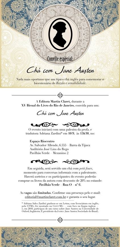 Entre as muitas atrações para os leitores modernos de Austen estão os detalhes domésticos que tanto embelezam seus romances, além disso, quer algo mais delicioso que um chá? O chá não era apenas uma bebida nos tempos de Austen, mas também um ingrediente chave para rituais sociais, e suas cartas e livros estão cheios de referências a respeito da compra, preparo, como eram servidos e bebidos os chás. Neste livro, os leitores encontrarão diversas citações de Austen sobre chás, além de uma excelente pesquisa sobre o chá na época de Jane e sobre a maneira como este era tomado em diferentes horas do dia e ambientes variados.