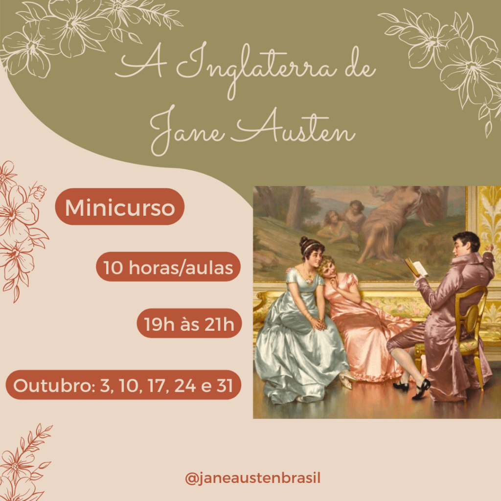 Ementa: Apresentar um panorama da vida e obra de Jane Austen, escritora inglesa do século 19. Analisar e discutir as características da sociedade inglesa daquela época, incluindo: a vida doméstica, a vida em sociedade, a Inglaterra na época de Jane Austen, o universo de Austen e as cidades/casas onde a escritora viveu. Apresentar o contexto sócio-histórico-cultural no qual suas obras foram escritas.