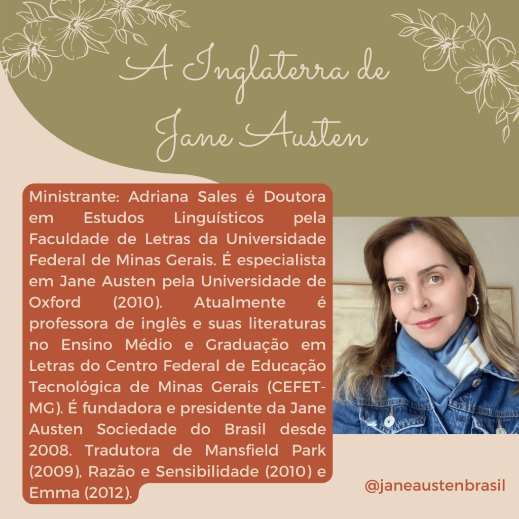 Ministrante: Adriana Sales é Doutora em Estudos Linguísticos pela Faculdade de Letras da Universidade Federal de Minas Gerais. É especialista em Jane Austen pela Universidade de Oxford (2010). Atualmente é professora de inglês e suas literaturas no Ensino Médio e Graduação em Letras do Centro Federal de Educação Tecnológica de Minas Gerais (CEFET-MG). É fundadora e presidente da Jane Austen Sociedade do Brasil desde 2008. Tradutora de Mansfield Park (2009), Razão e Sensibilidade (2010) e Emma (2012).
