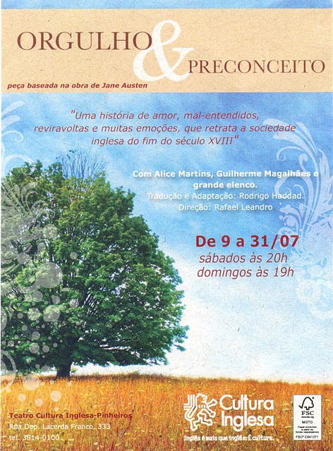 De 09 a 31 de julho, o público poderá conferir o espetáculo “Orgulho e Preconceito”, versão teatral do clássico da escritora britânica Jane Austen (1775-1817), no Teatro Cultura Inglesa-Pinheiros. Sob direção de Rafael Leandro, a montagem do grupo Fora de Foco coloca em cena Alice Martins, Guilherme Magalhães, Vanessa Zorzetti, Renato Milan, Stéphani Stozek, entre outros. A tradução e adaptação são de Rodrigo Haddad.
