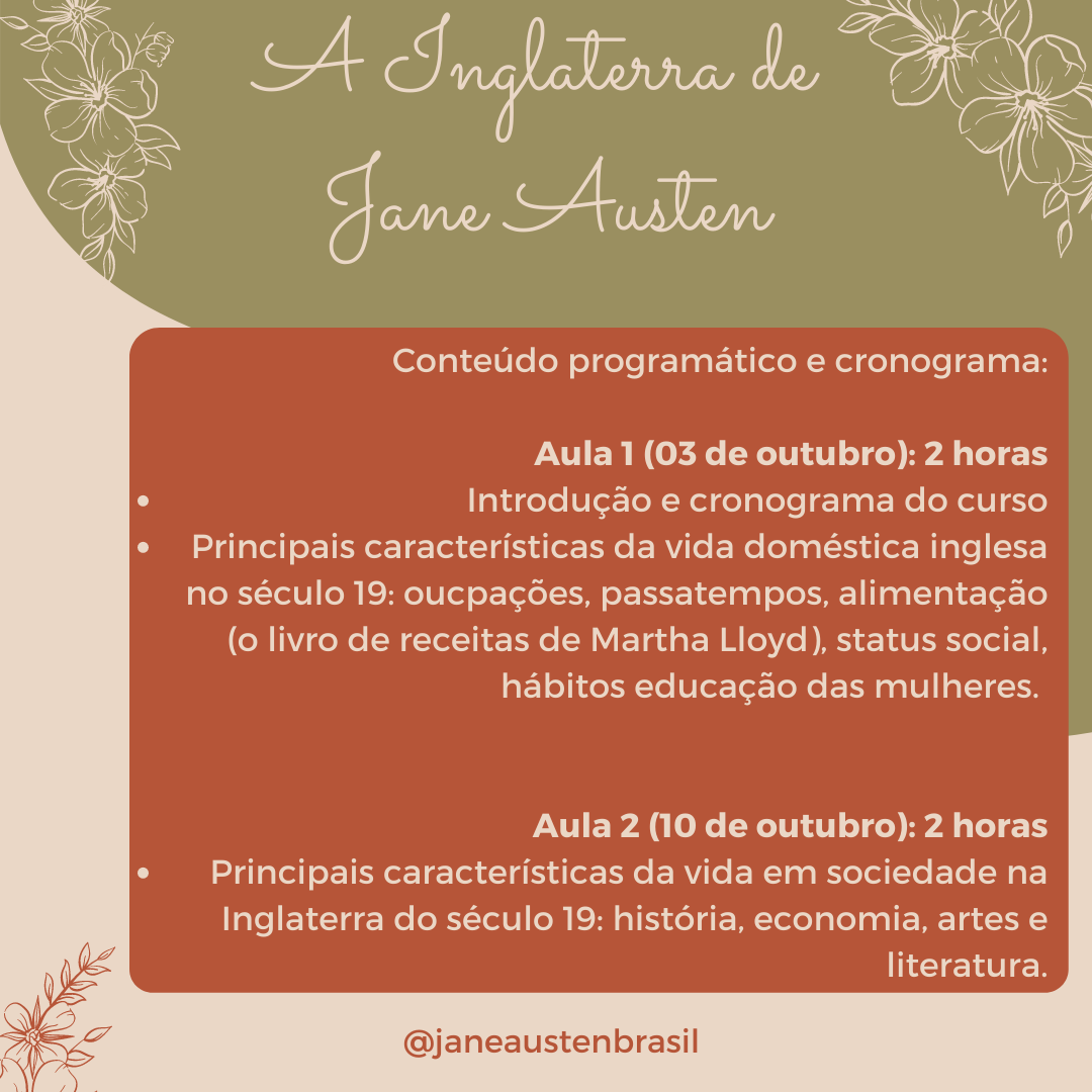 Ementa: Apresentar um panorama da vida e obra de Jane Austen, escritora inglesa do século 19. Analisar e discutir as características da sociedade inglesa daquela época, incluindo: a vida doméstica, a vida em sociedade, a Inglaterra na época de Jane Austen, o universo de Austen e as cidades/casas onde a escritora viveu. Apresentar o contexto sócio-histórico-cultural no qual suas obras foram escritas.