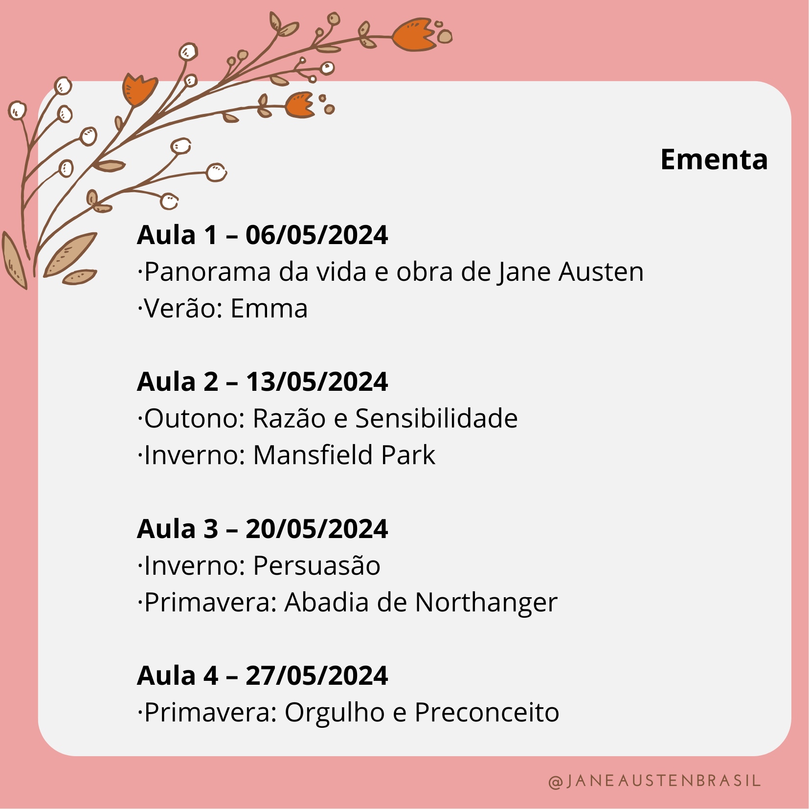 Ementa: Apresentar o panorama da vida e obra de Jane Austen, escritora inglesa do século 19. Analisar e discutir a obra “Mansfield Park”, romance escrito por Austen em 1814. Analisar e discutir as adaptações deste livro para o cinema e a televisão.