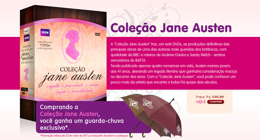 Por indicação da Meire Souza e Fabia Rossoni, aqui está uma promoção imperdível: o box da LogOn com 8 discos, incluindo: Orgulho e Preconceito (1995), Emma (2009), Razão e Sensibilidade (2008) e Persuasão (2007). Por apenas R$ 59,90.