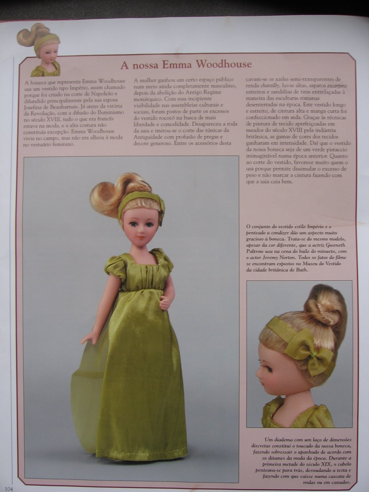 Esta dica vai para quem está colecionando as bonequinhas de porcelana baseadas nas personagens de Austen! Apesar de Lizzy Bennet (número 10) ter saído há apenas duas semanas, Emma Woodhouse (número 13) já está nas bancas desde a sexta-feira passada. Segundo o jornaleiro, a editora saltou dois fascículos, provavelmente porque o carregamento não deve ter sido liberado, ou ainda não chegou ao Brasil. Felilzmente a Emma está nas bancas! Vejam como é linda! O fascículo que veio junto com a boneca, trouxe informações sobre a personagem (diferente do fascículo sobre Elizabeth Bennet). Para saber maiores detalhes sobre a coleção leia aqui. Dá para perceber que Emma foi baseada na Gwyneth Paltrow! O vestidinho verde está bem a cara do filme de 1996.