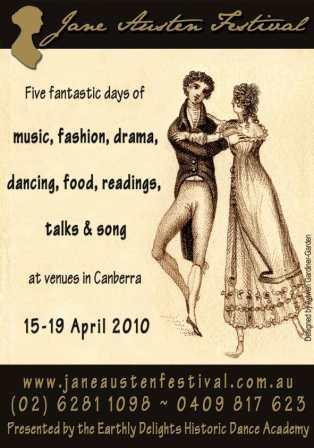 Para aqueles que estiverem de passagem pela Austrália, uma boa pedida é participar do Festival Jane Austen que irá acontecer de 15 a 19 de abril de 2010, na cidade de Camberra. Serão cinco dias de muita música, dança, moda, comida, encenações, leituras e bate-papo. Quem quiser maiores informações, é só dar uma passadinha no site do JAFA (Jane Austen Festival Australia).