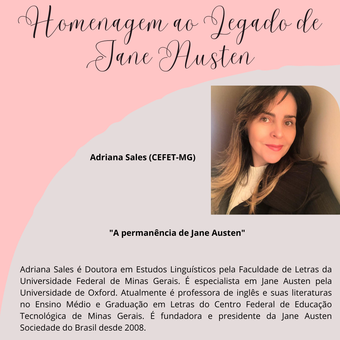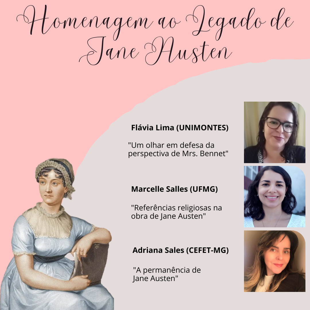 Em homenagem aos 205 anos de morte da escritora faremos três palestras sobre a trajetória literária da autora, em parceria com a Jane Austen Sociedade do Brasil. Na ocasião, a Dra. Adriana Sales aborda “A permanência de Jane Austen”; a mestre Marcelle Salles ressalta as “Referências religiosas em Jane Austen” e a mestre Flávia Lima apresenta “Defendendo a perspectiva da Mrs. Bennet”.