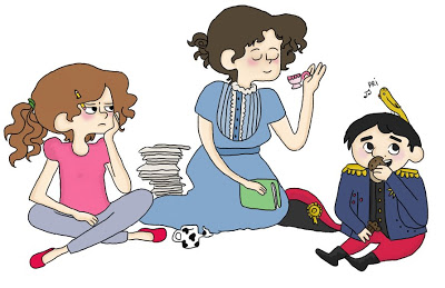 Jane Austen tomando chá com Napoleão. Esta ilustração originalmente foi desenhada em papel e depois transferida para o computador onde Irena pintou.