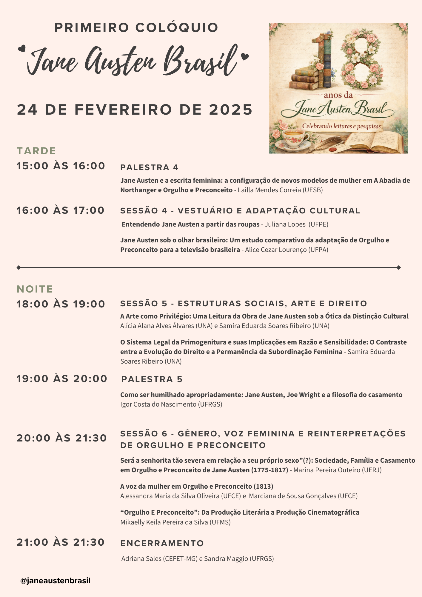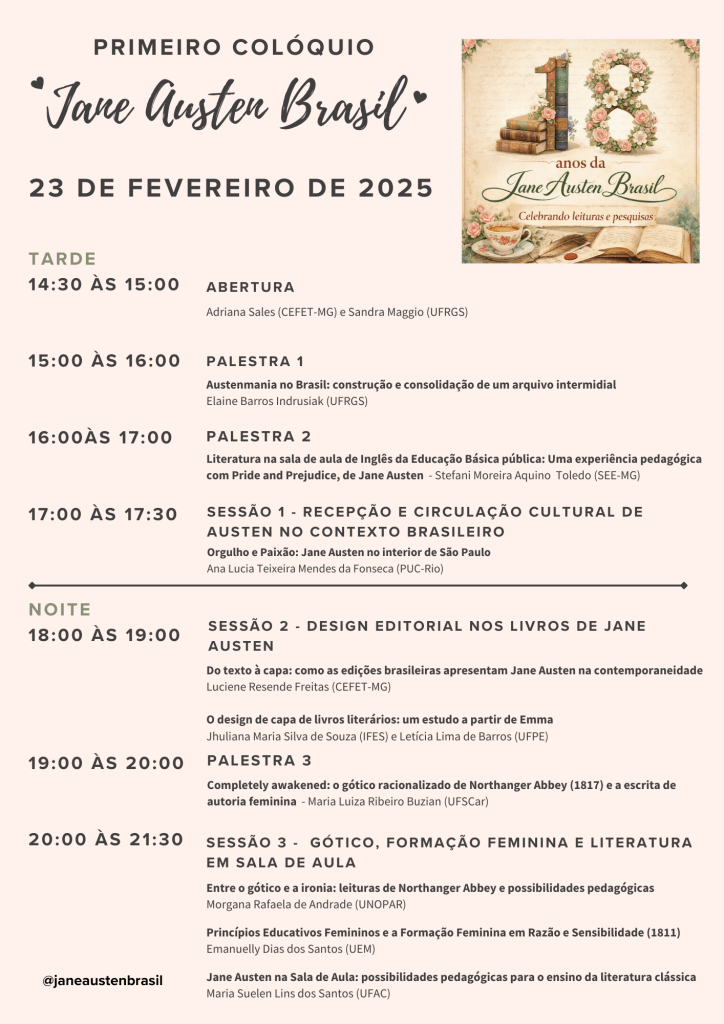 Celebrando os 250 anos de Jane Austen de Norte a Sul do Brasil! Com palestras de pesquisadores de todas as regiões do Brasil! Inscrições para ouvintes AQUI.