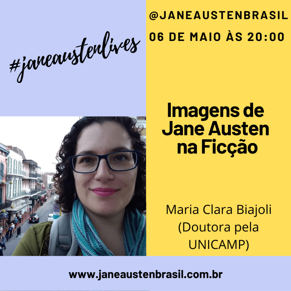 Nossa próxima #janeaustenlives será no dia 06 de maio às 20:00 (horário de Brasília) será com a Maria Clara Biajoli, que já fez uma live conosco e está disponível no nosso canal no Youtube! Para participar das nossas lives, basta seguir nosso perfil @janeaustenbrasil no Instagram. Vamos falar um pouco sobre a vida de Jane Austen e as formas como ela foi reconstruída pela sua família ao longo do século XIX e como aparece hoje na ficção de fãs que tomam a própria Austen como heroína de seus romances.