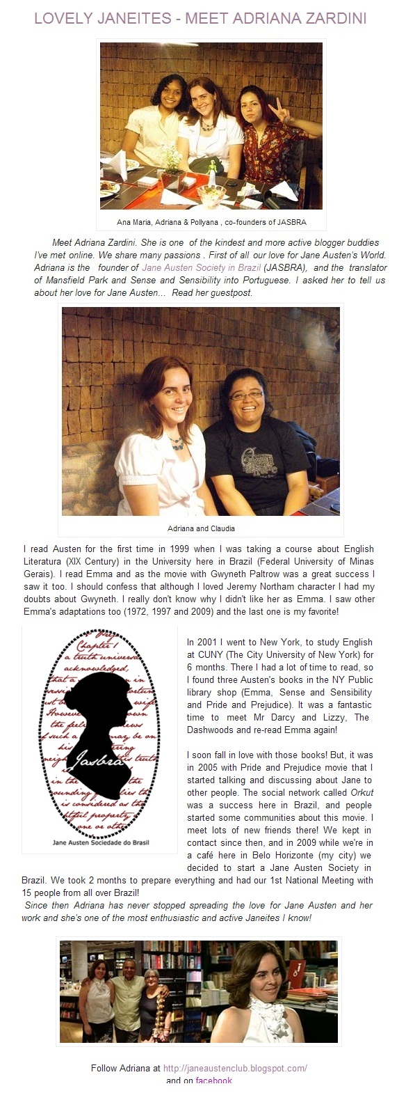 Fui convidada a escrever um post sobre o início da JASBRA para o blog da Maria Grazia: My Jane Austen Book Club. O blog é escrito por uma italiana (professora de inglês). Conheci Maria há algum tempo e agora que descobrimos que temos a mesma profissão, estamos trocando algumas dicas e ideais para lecionar inglês como língua estrangeira.