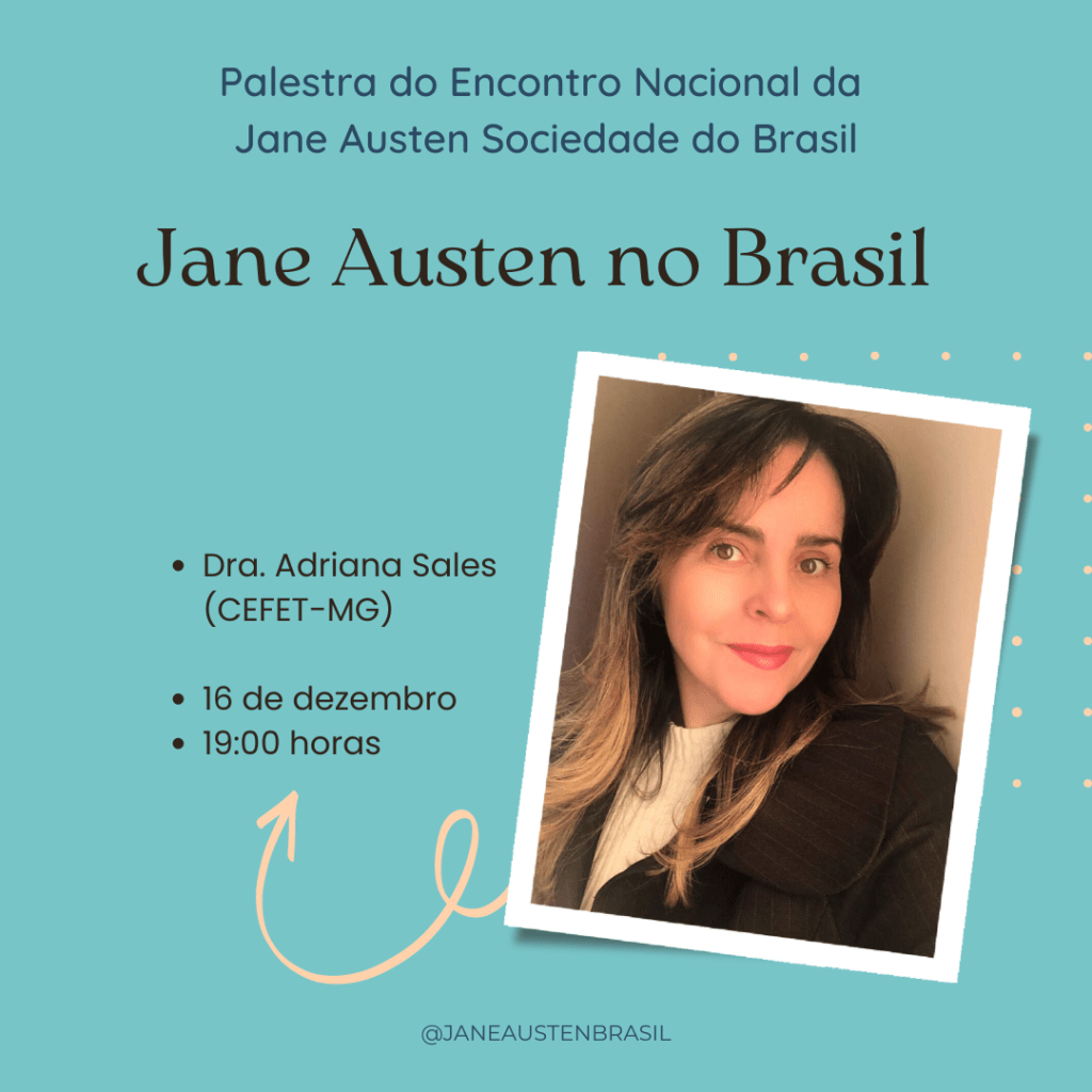 O Encontro tem início na sexta-feira, 16, a partir das 19h. A Dra. Adriana Sales apresenta a palestra “Jane Austen no Brasil” e fala sobre a recepção de Austen em nosso país, que é formada por um fandom digital muito variado, constituído por leitores das mais variadas formações e idades.