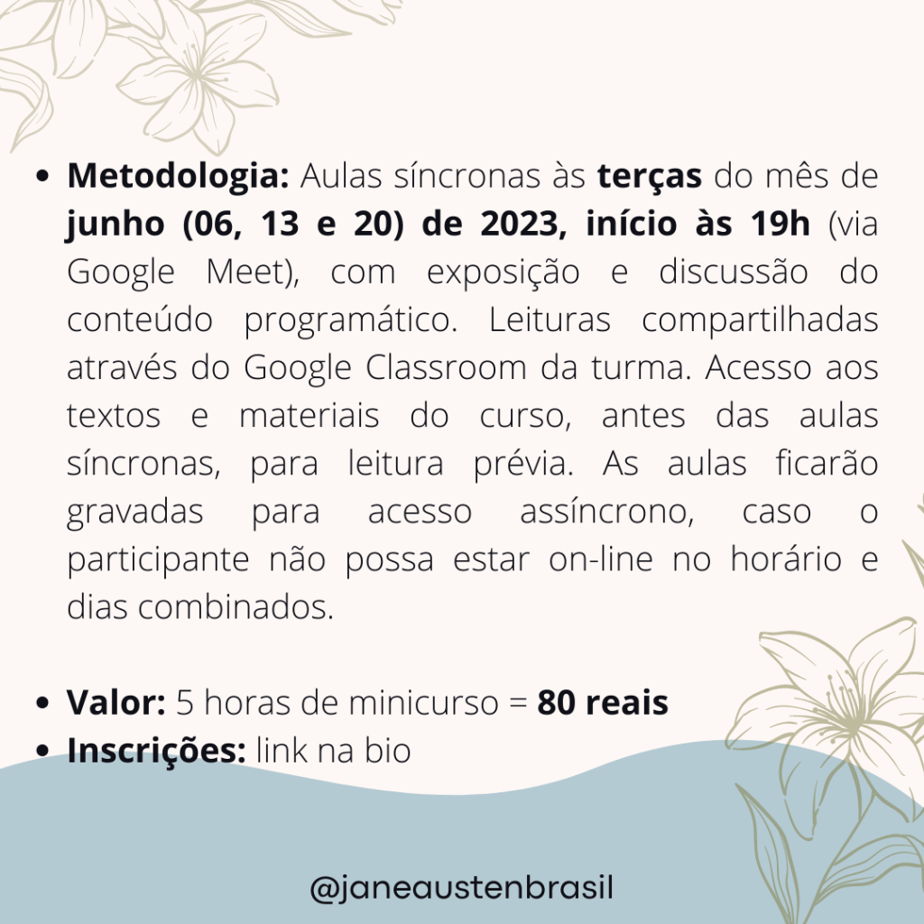 Ementa: Apresentar um breve panorama da vida e obra de Jane Austen, escritora inglesa do século 19. Analisar e discutir a obra “SANDITION”, romance epistolar inacabado, escrito por Austen entre janeiro e março de 1817. A transcrição completa do romance foi publicada em 1925, sob o nome Sanditon – a fragment of a novel. Analisar e discutir as características do romance e a adaptação seriada para a televisão “Sanditon” (2019 – 2023).