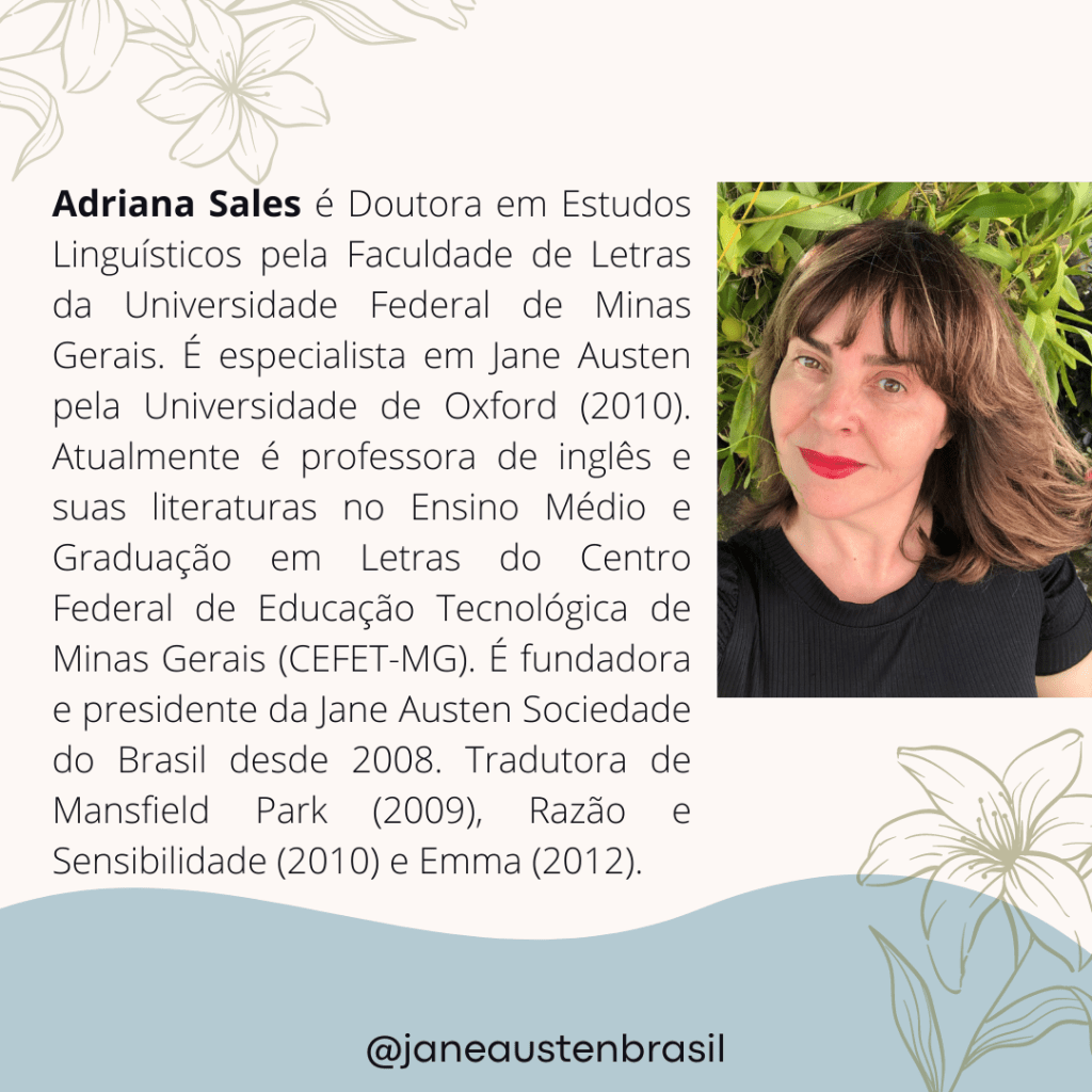 Ministrante: Adriana Sales é Doutora em Estudos Linguísticos pela Faculdade de Letras da Universidade Federal de Minas Gerais. É especialista em Jane Austen pela Universidade de Oxford (2010). Atualmente é professora de inglês e suas literaturas no Ensino Médio e Graduação em Letras do Centro Federal de Educação Tecnológica de Minas Gerais (CEFET-MG). É fundadora e presidente da Jane Austen Sociedade do Brasil desde 2008. Tradutora de Mansfield Park (2009), Razão e Sensibilidade (2010) e Emma (2012).