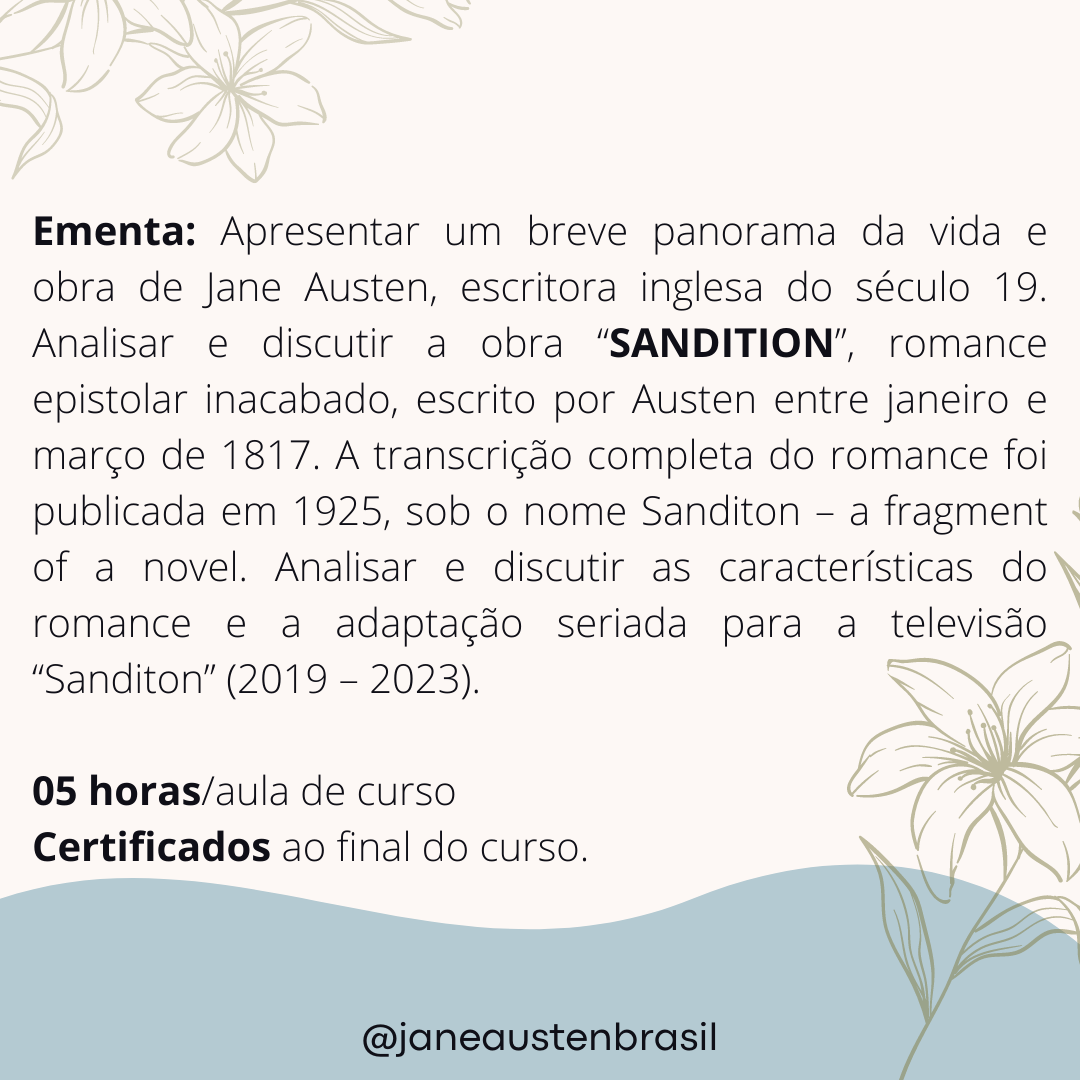 Ementa: Apresentar um breve panorama da vida e obra de Jane Austen, escritora inglesa do século 19. Analisar e discutir a obra “SANDITION”, romance epistolar inacabado, escrito por Austen entre janeiro e março de 1817. A transcrição completa do romance foi publicada em 1925, sob o nome Sanditon – a fragment of a novel. Analisar e discutir as características do romance e a adaptação seriada para a televisão “Sanditon” (2019 – 2023).