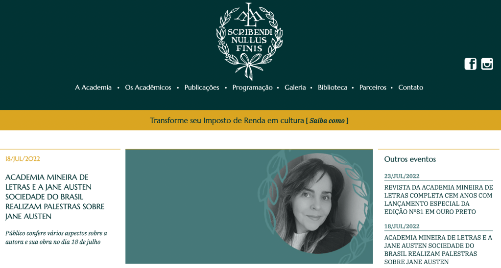 Um dos maiores nomes da literatura mundial, com milhares de fãs, ganha um evento especial na Academia Mineira de Letras. Jane Austen e sua obra será debatida em três palestras na AML no dia 18 de julho, a partir das 19h30. Na ocasião a Dra. Adriana Sales aborda “A permanência de Jane Austen”; a mestre Marcelle Salles ressalta as “Referências religiosas em Jane Austen” e a mestre Flávia Lima apresenta “Defendendo a perspectiva da Mrs. Bennet”.