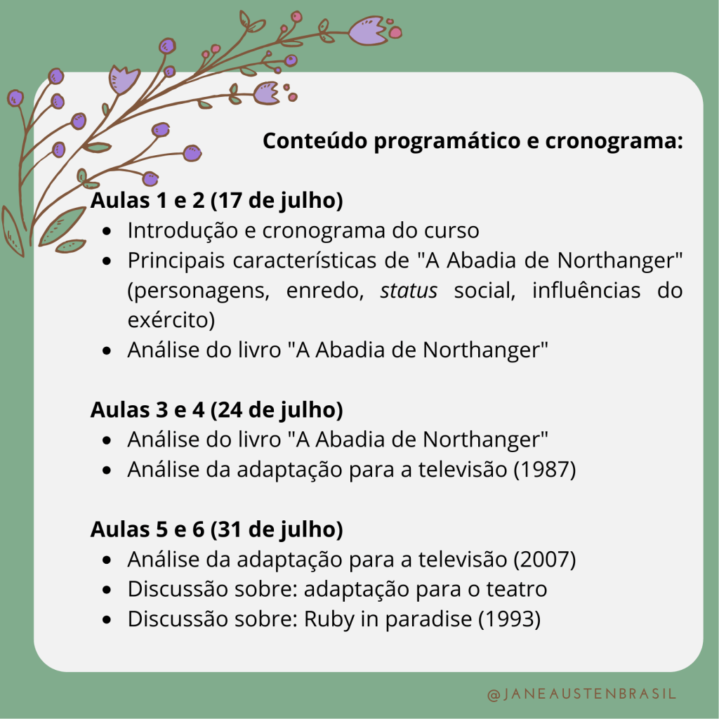 Ementa: Apresentar o panorama da vida e obra de Jane Austen, escritora inglesa do século 19. Analisar e discutir a obra “A Abadia de Northanger”, primeiro romance escrito por Austen, porém, publicado após sua morte em 1817. Analisar e discutir as adaptações fílmicas e para o teatro de “A Abadia de Northanger”.