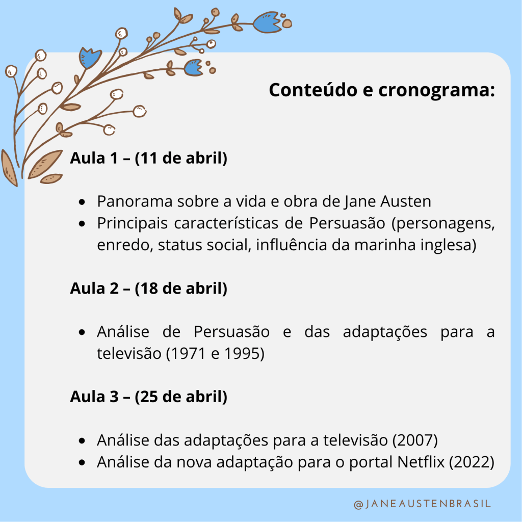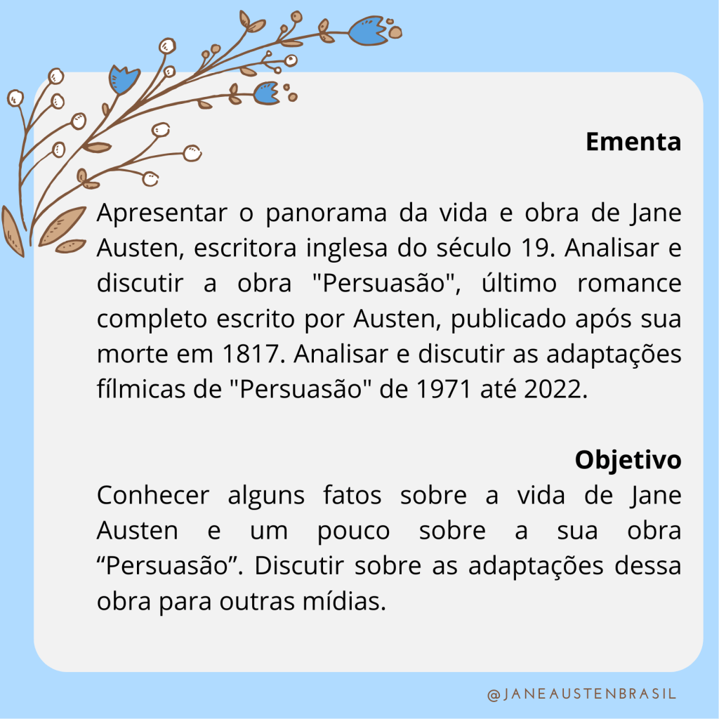Ementa: Apresentar o panorama da vida e obra de Jane Austen, escritora inglesa do século 19. Analisar e discutir a obra “Persuasão”, último romance completo escrito por Austen, publicado após sua morte em 1817. Analisar e discutir as adaptações fílmicas de “Persuasão” de 1971 até 2022.