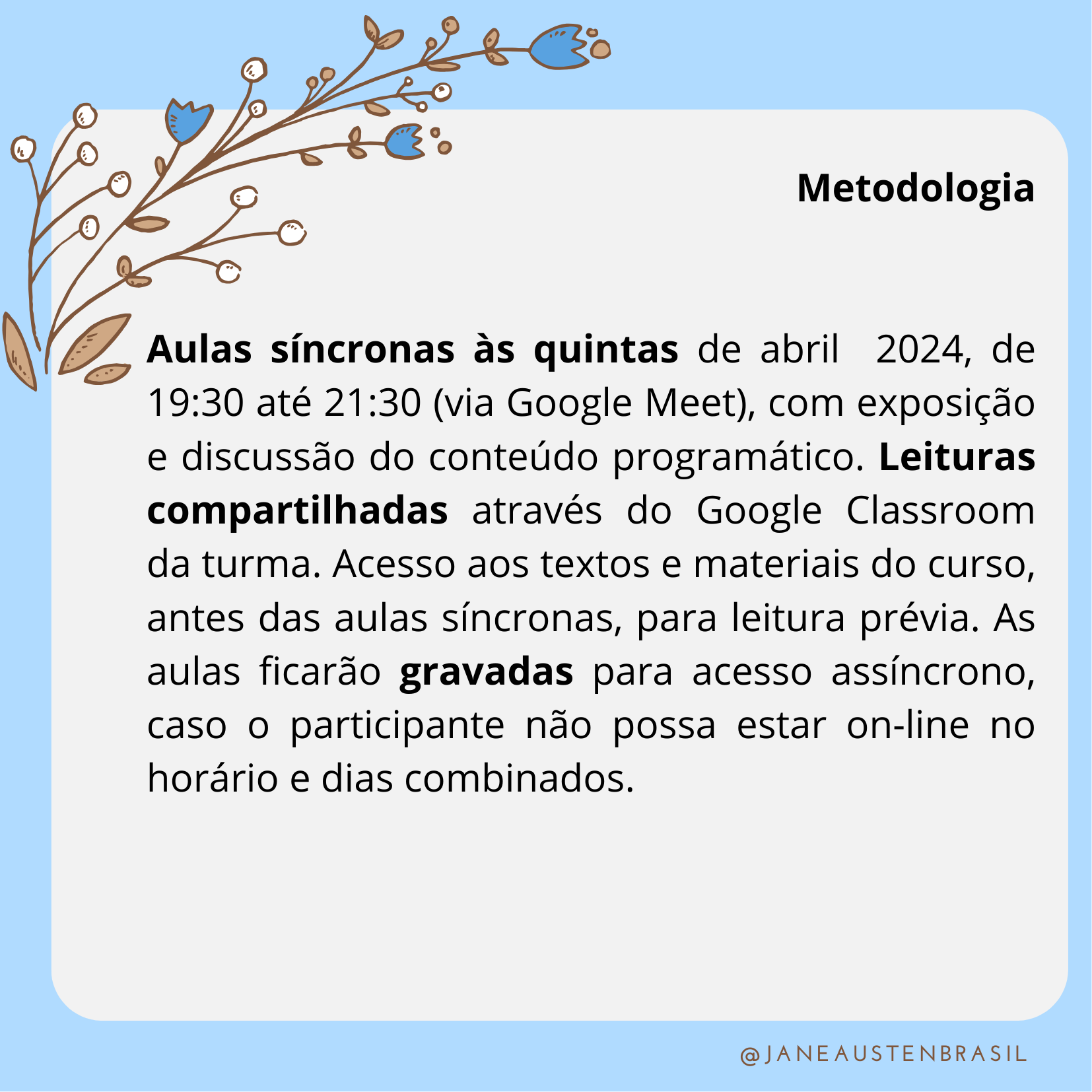 Metodologia: Aulas síncronas às quintas do mês de abril de 2024, das 19:30 às 21:30 (Google Meet), com exposição e discussão do conteúdo programático. Leituras compartilhadas através do Google Classroom da turma. Acesso aos textos e materiais do curso, antes das aulas síncronas, para leitura prévia.