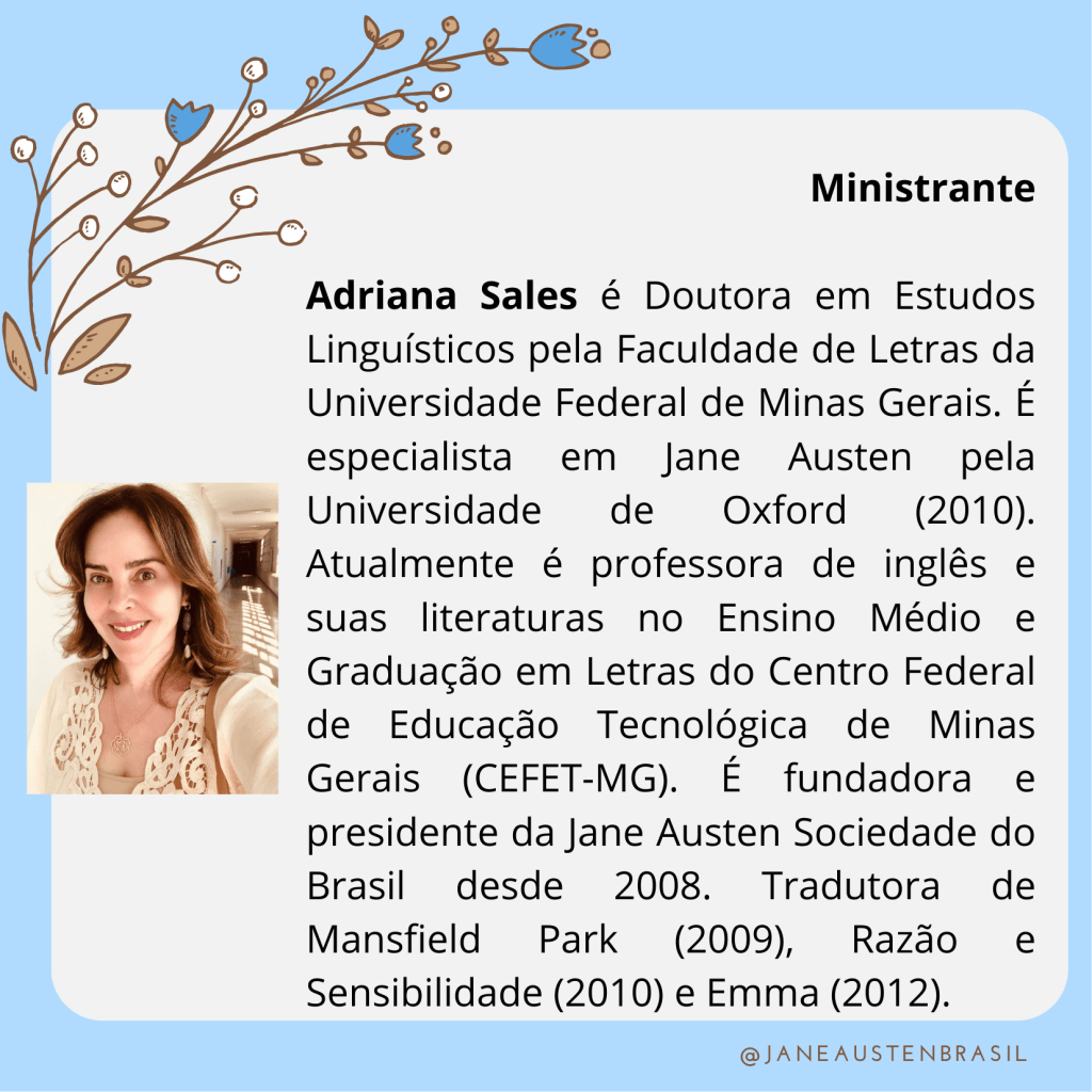 Adriana Sales é Doutora em Estudos Linguísticos pela Faculdade de Letras da Universidade Federal de Minas Gerais. É professora de inglês e suas literaturas no Ensino Médio e Graduação em Letras do Centro Federal de Educação Tecnológica de Minas Gerais (CEFET-MG). É especialista em Jane Austen pela Universidade de Oxford (2010). É fundadora e presidente da Jane Austen Sociedade do Brasil desde 2008.