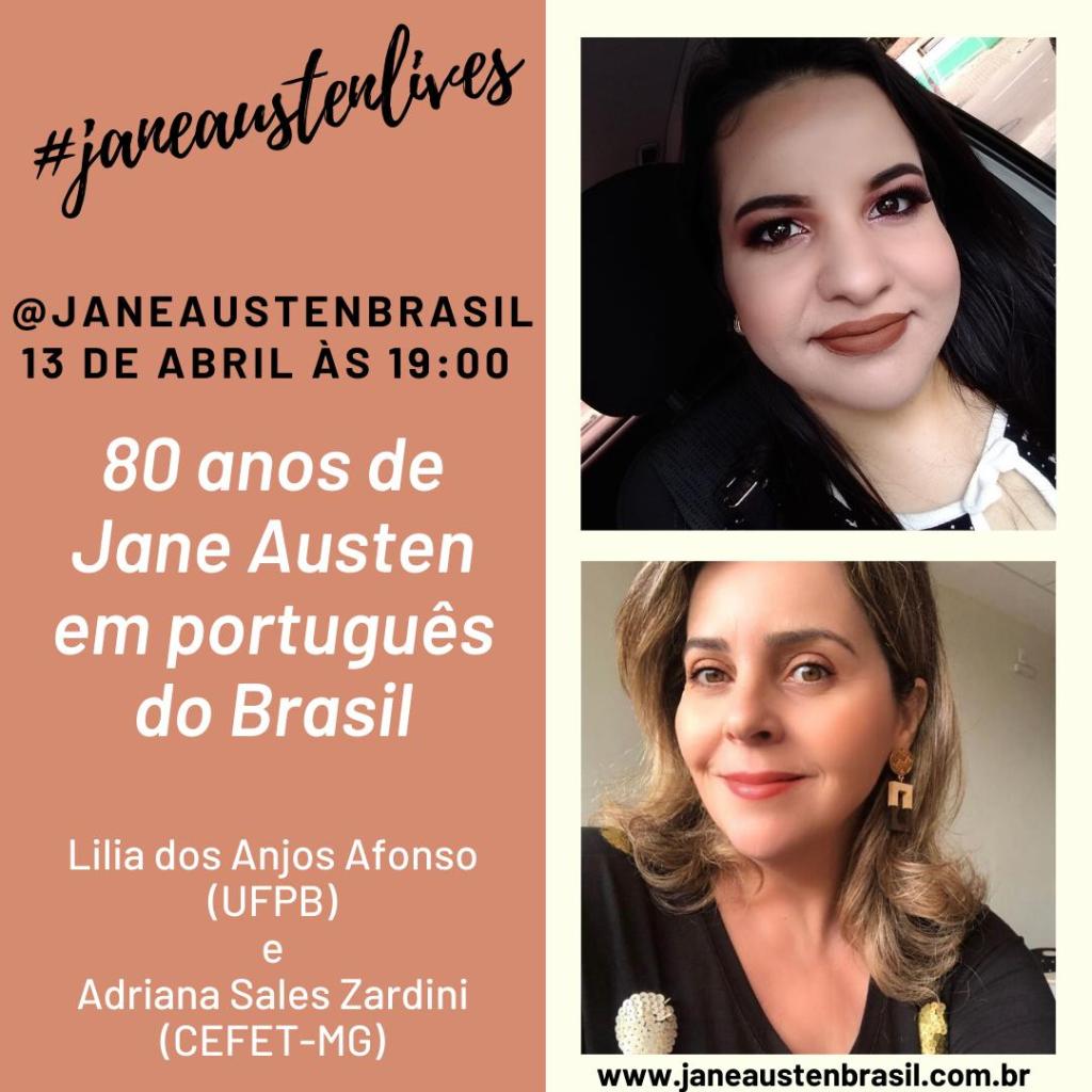 #janaustenlives está sendo um sucesso! Amanhã (13 de abril às 19:00) teremos nossa sexta live e, desta vez, Adriana Sales (CEFET-MG) e Lilia dos Anjos (UFPB) farão uma live sobre as traduções de Jane Austen aqui no Brasil – projeto de pesquisa (CEFET-MG) que está em andamento! Este ano faz 80 anos que foi lançada a primeira tradução de Jane Austen aqui no Brasil: Orgulho e Preconceito, traduzida por Lúcio Cardoso (1940) e publicada pela editora José Olympio.