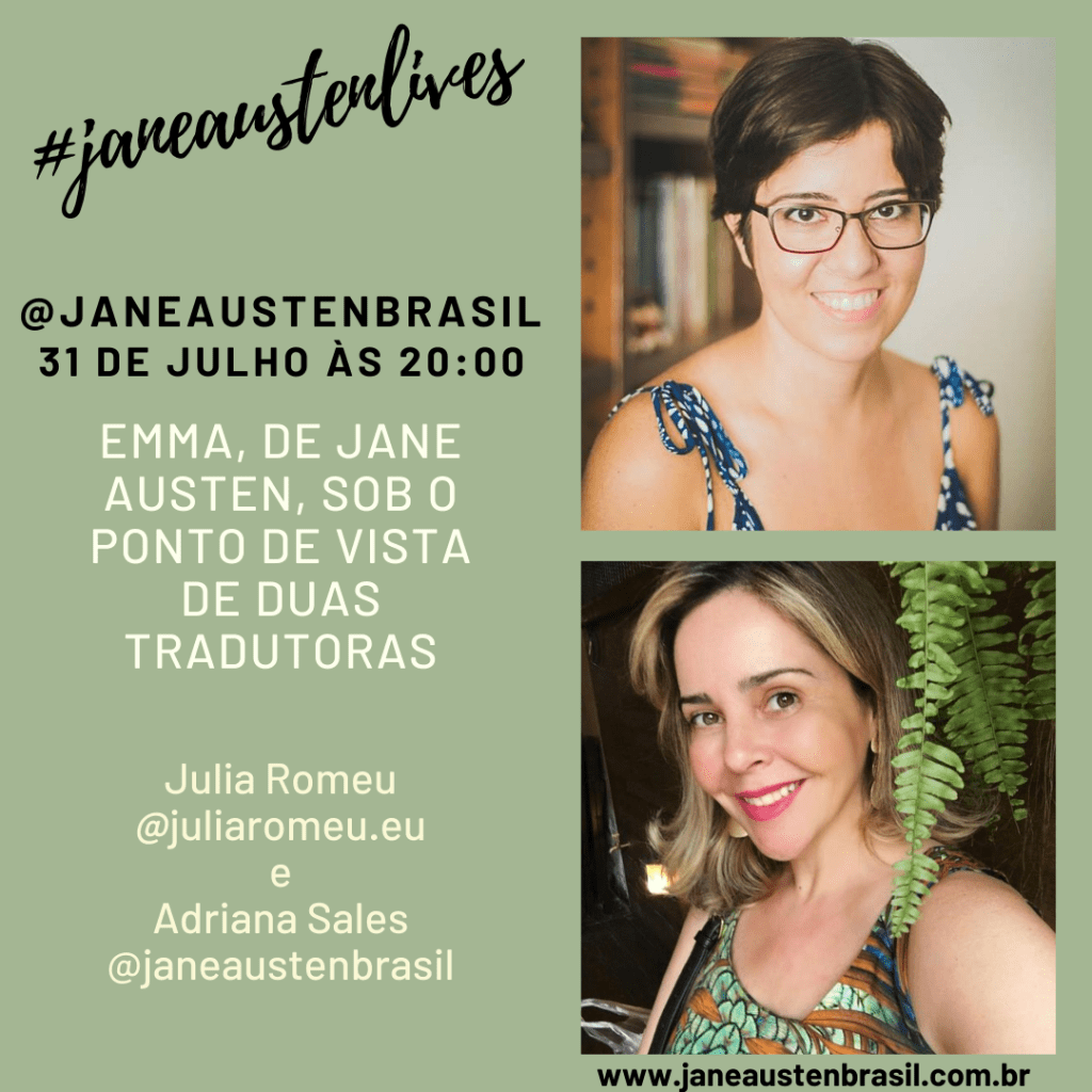 Na #janeaustenlives de hoje, 31 de julho de 2020 às 20:00, vamos ter uma live sobre Emma – do ponto de vista de duas tradutoras: Adriana Sales e Julia Romeu. Não percam! Nosso encontro será no @janeaustenbrasil no Instagram.